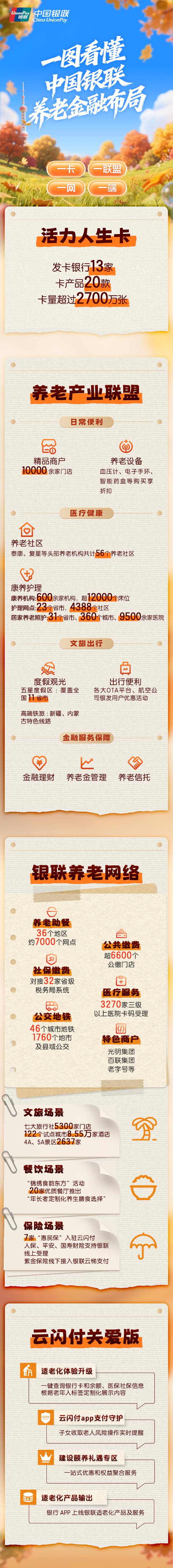 随着重阳节的暖阳洒遍大地,养老金融正在从政策理念转化为具体行动。中国银联以其特有的产业平台优势,联合商业银行、养老机构、科技企业等各方力量,让养老金融不再是冰冷的数字,而是化作了社区食堂的热乎饭菜、景区门口的便捷支付、医院就诊支付的顺畅体验。这种“金融+场景+服务”的创新模式,正是养老金融从概念走向实践的最佳诠释——在服务民生中彰显金融温度,在守正创新中践行责任担当,为“老有所养、老有所乐、老有所安”写下生动注脚。