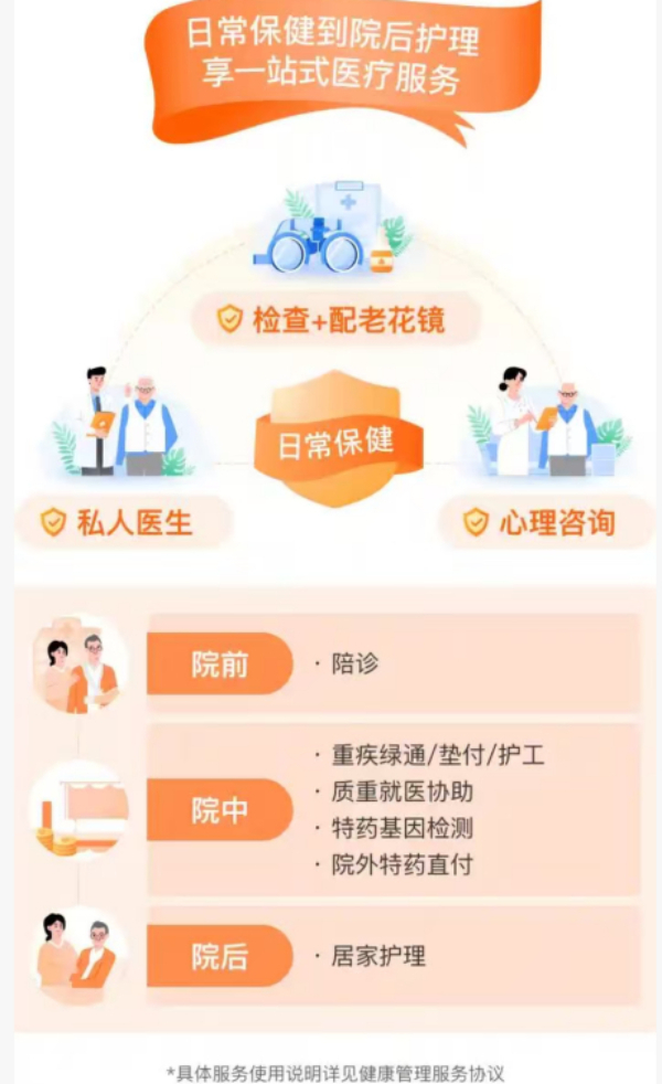健康服务更多元。“孝顺保·中老年医疗险2.0”新增一系列健康服务,包括中老年群体的日常保健,院前陪诊,院中重疾绿色通道、住院垫付、住院护工等服务,院后居家护理等方面,为中老年人提供“全周期”定制化服务,进一步丰富了“防、控、治、康、养”医养结合模式。