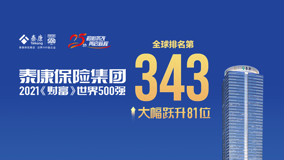 泰康保险集团世界500强排名大幅跃升 位列343名