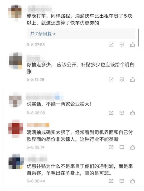 但也有不少网民对滴滴拆解抽成、列举用途的做法并不买账,认为有偷换概念、转移视线之嫌,“不可能只有20.9%的抽成,实际比这个高得多”“乘客补贴10.9%,我怎么没收到?”“大数据想怎么玩就怎么玩!”“反正是垄断,你说什么就是什么”。有网民称,烧钱补贴乘客不是理由,成本高利润低也不是理由,这些钱如果不从司机那里抽就得平台自己出,这本身就是它的成本!