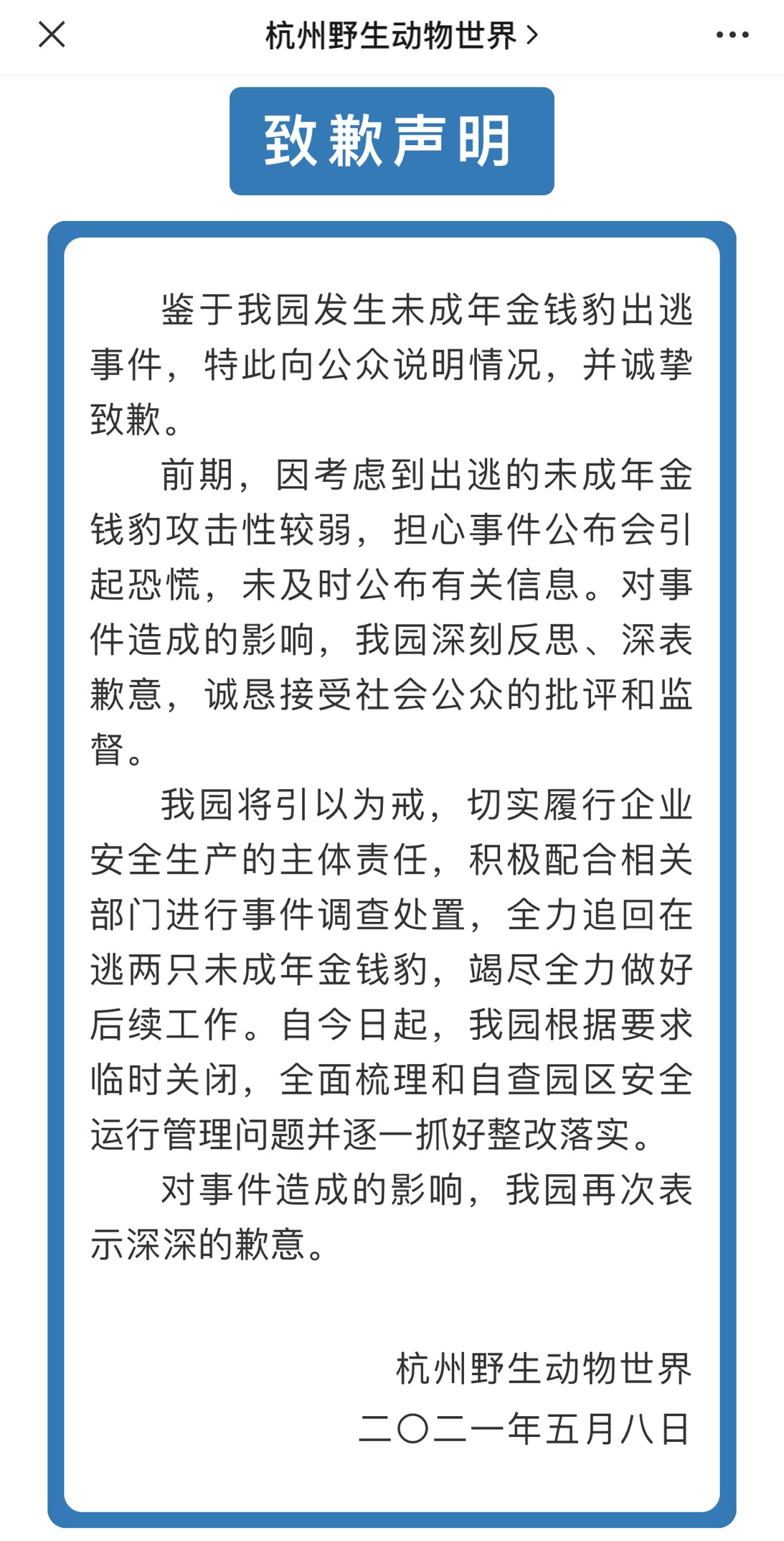 ▲杭州野生动物世界致歉声明。