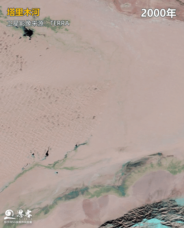 ▲卫星拍到的塔里木河2000与2019年对比图。卫星数据来源:TERRA