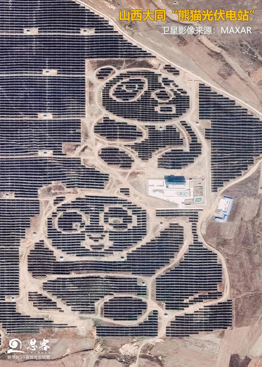 位于山西大同市郊的“熊猫光伏电站”是全球首个以熊猫为造型的光伏电站,从空中俯瞰,两个憨态可掬的熊猫宝宝在大地上扮萌,格外引人注目。