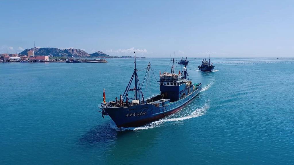 2021年黄渤海伏季休渔期结束后,山东荣成大批渔船扬帆出海奔赴蔚蓝,耕海牧渔。