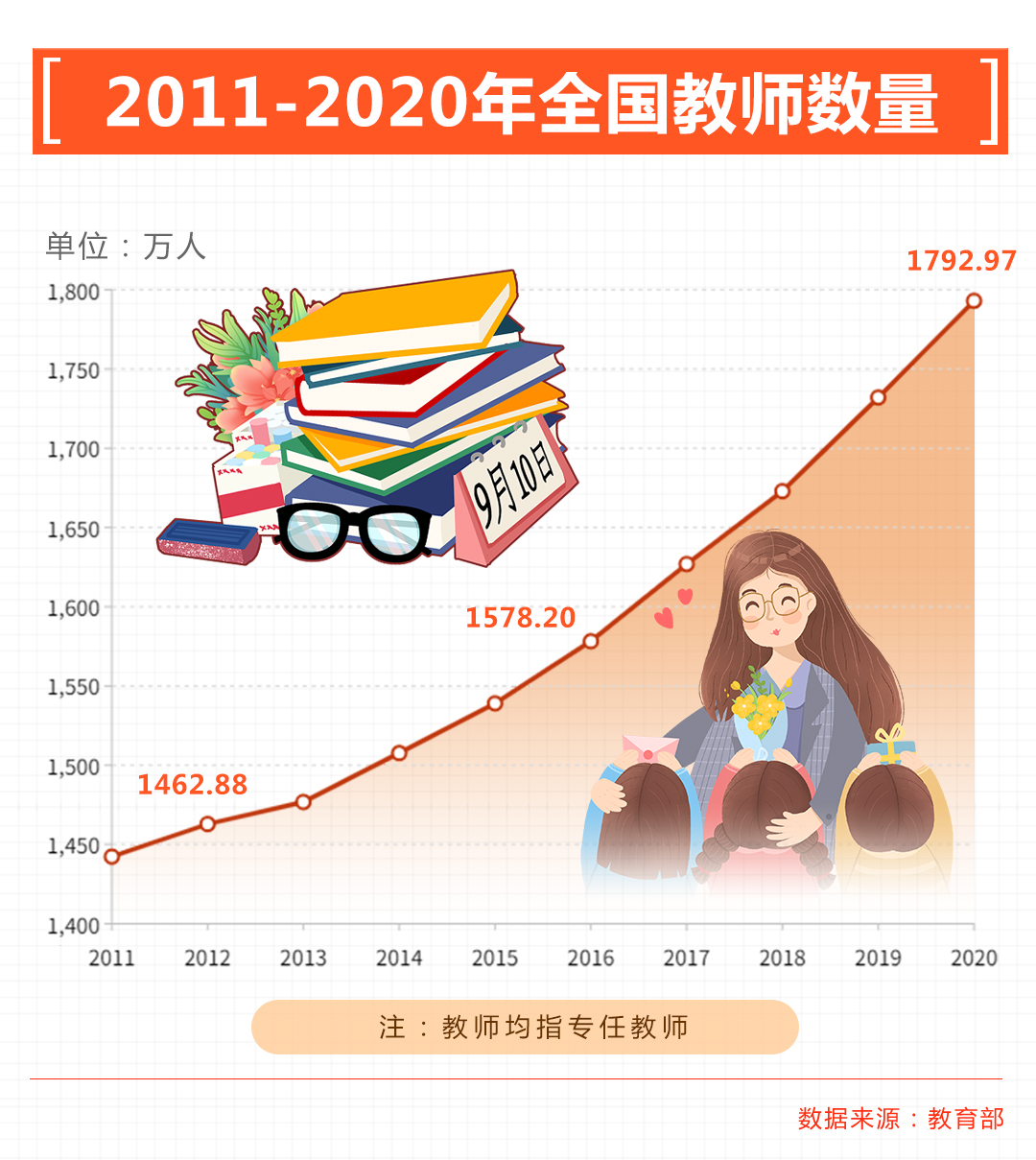 我国现有各级各类专任教师1792.97万人,分布在53.71万所学校和幼儿园,为2.89亿在校生传道授业,支撑起了世界上最大规模的教育体系。