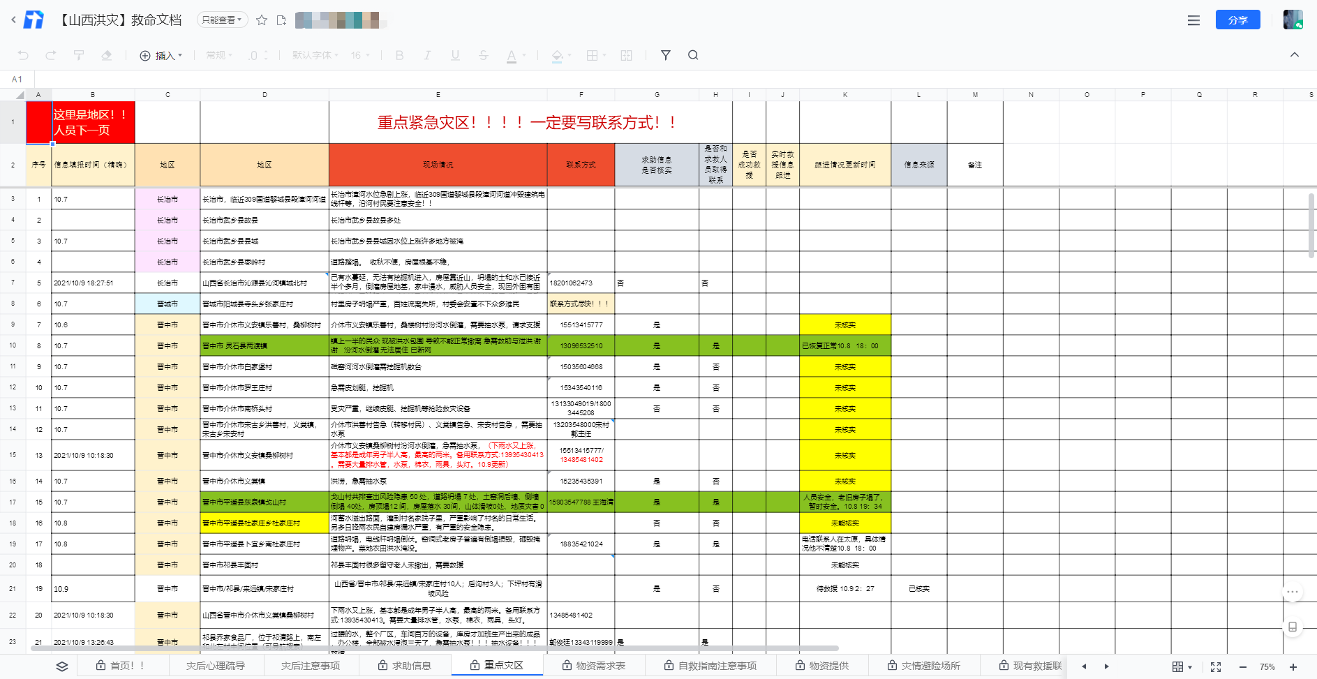 这几日,文档中求助信息标注“已解决”“已转移”的内容越来越多,希望它在不久的未来,能从满屏的花花绿绿再次回到一片空白,受灾的人们也能回到简单朴素的日常。