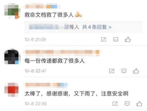 这份文档传播迅速及时。10月9日,和“救命文档”相关的讨论达到热度高峰。众多网友接续加入,守望相助,共同确保信息的精准和需求的匹配。在文档传播了几天后,为了保证信息的真实准确,对外编辑权限改为填写信息收集表,并由管理员进行更新。
