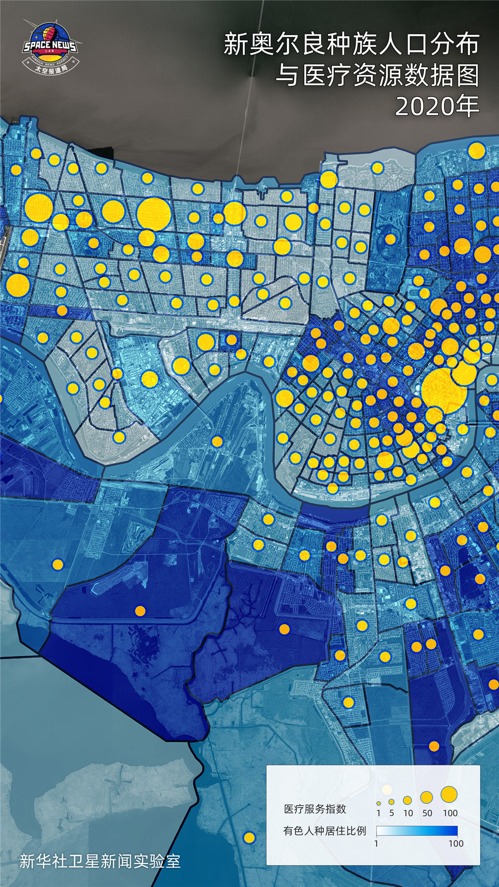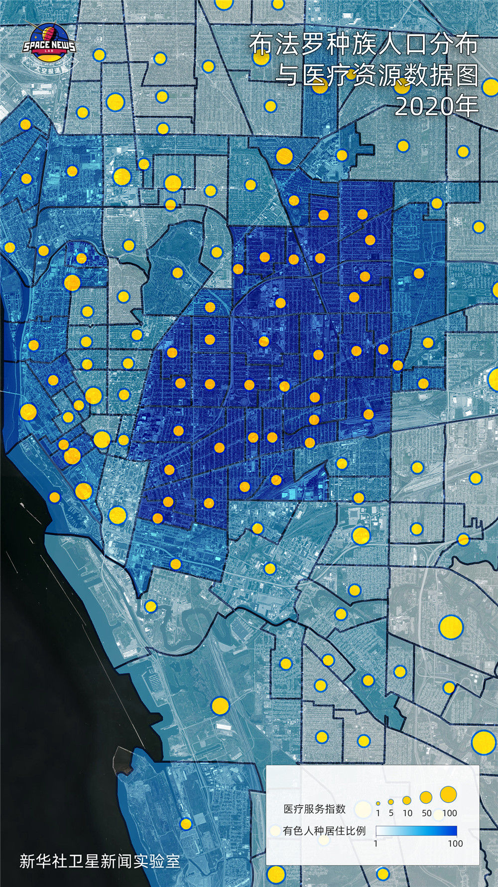 在这张根据Open Street Map开源数据制作的数据地图中,黄色圆点越大,代表区域内人均可获得的医疗资源越多。实际上,仅看分布密度,有色人种社区就与白人社区存在明显差异。
