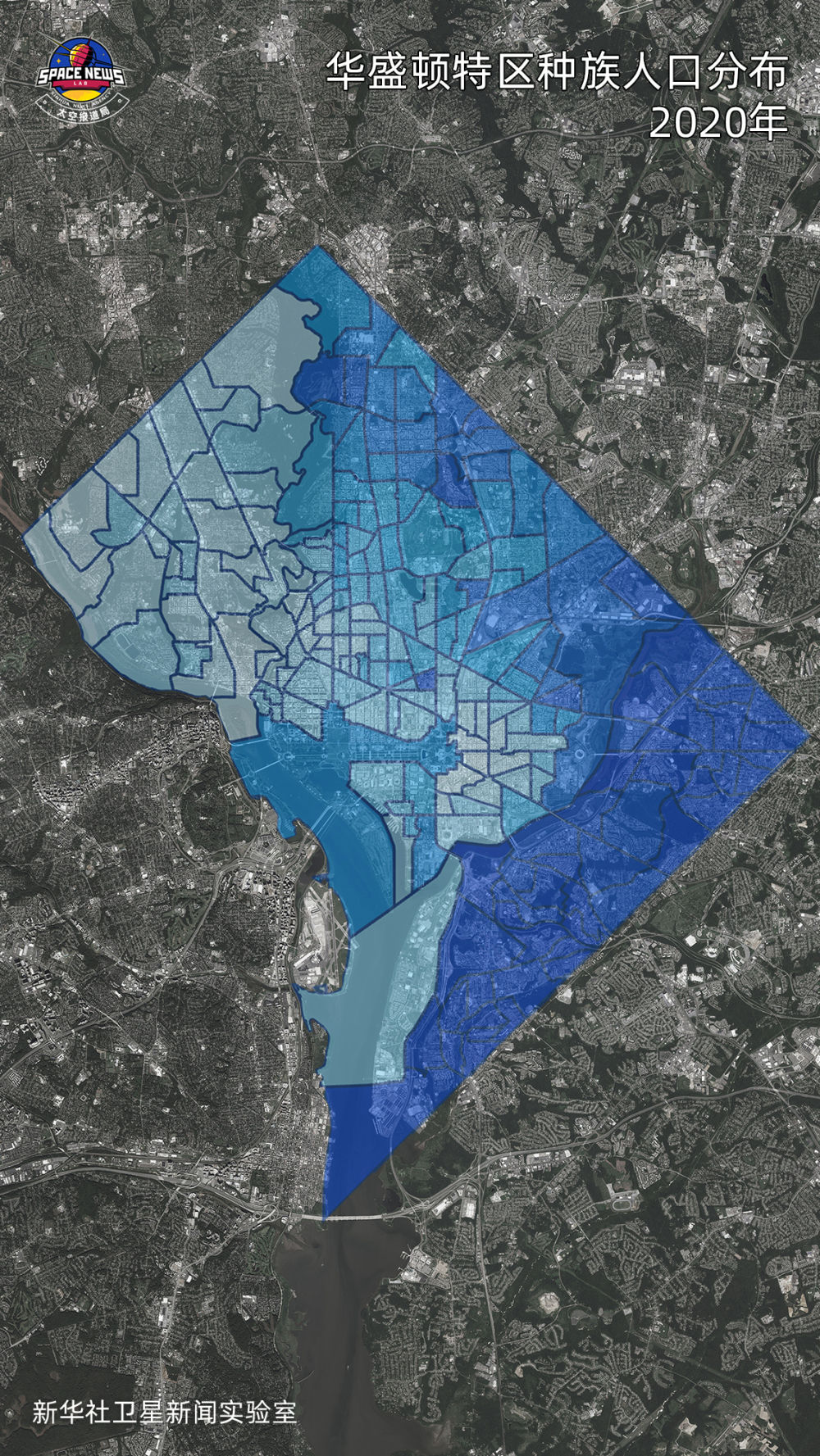 从白宫向东12公里,大约驾车17分钟,就会抵达阿纳卡斯蒂亚河岸边——特区监狱、肯尼迪体育场以及更北边的国家植物园。利用2020年美国人口普查数据,可计算不同区域中不同肤色人种的比例。