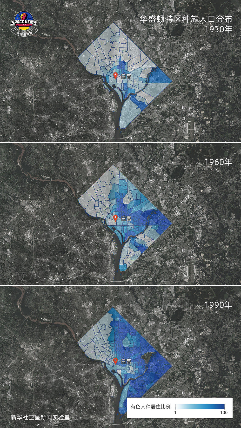 1930年的华盛顿特区,以白宫为原点,各个方向几乎都分布着有色人种聚居区。90年过去,虽然有色人种数量快速增加,但城市更加明显地向东西两个方向分裂。