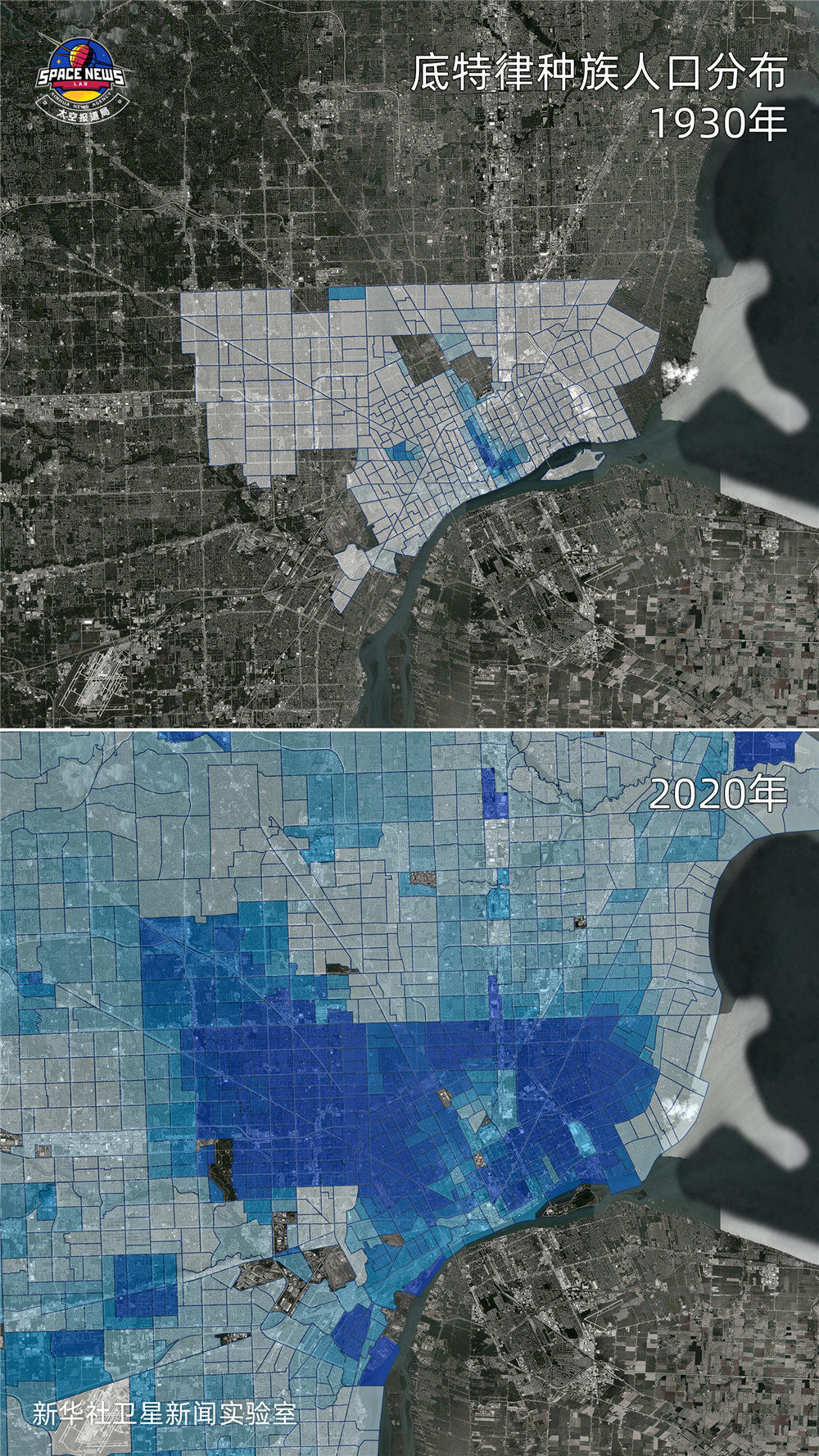 通过商业卫星影像、公开的人口普查统计、POI(地图信息点)等一系列数据,美国城市顽疾显现:无论如何扩张和变化,种族歧视带来的分裂始终存在,绝大多数黑人和其他有色人种只能一直生活在“自己的社区”。