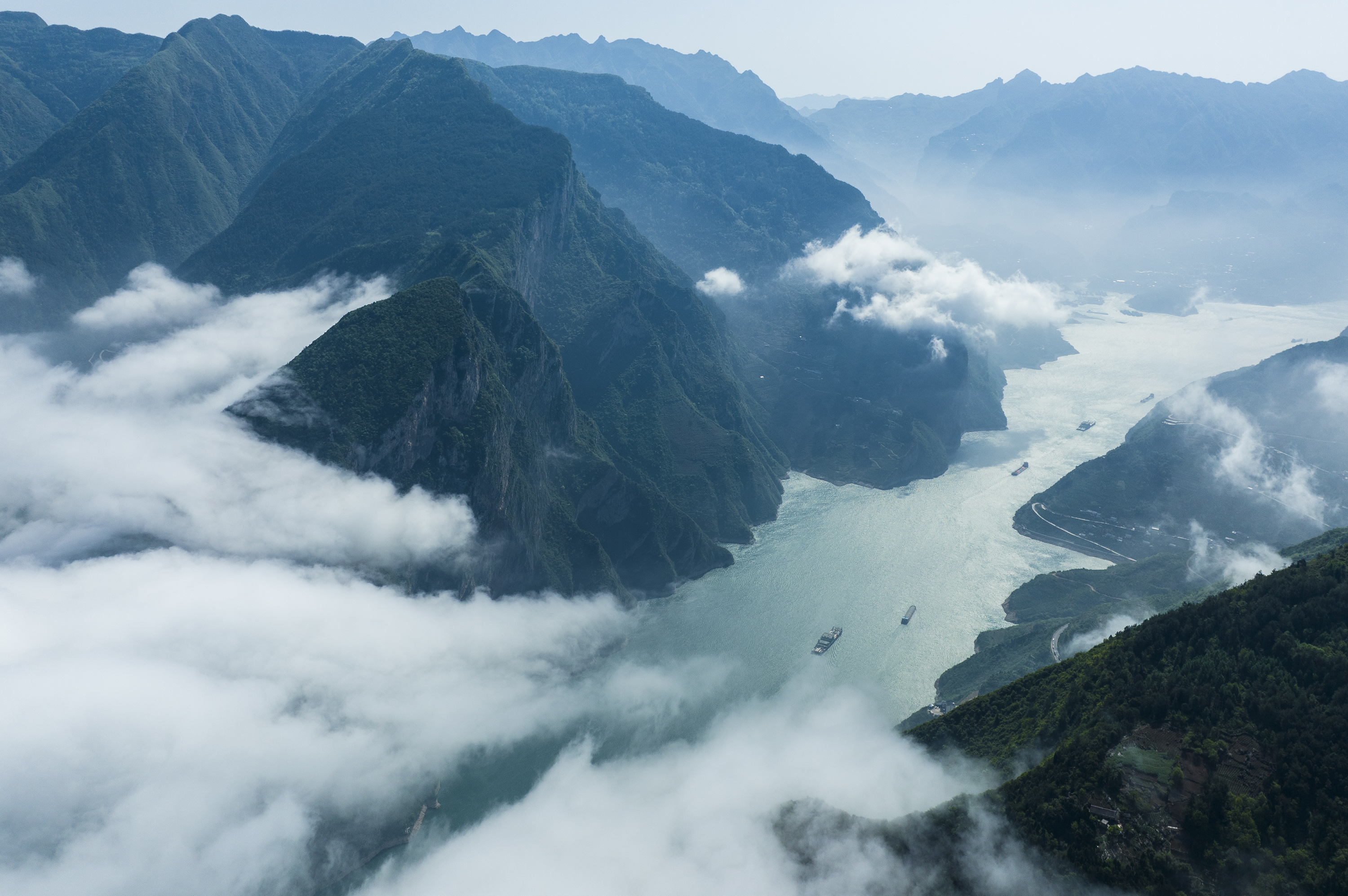 船舶行驶在长江三峡西陵峡湖北省宜昌市秭归县水域(无人机照片)。新华社发(郑家裕 摄)