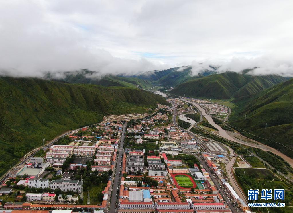 这是8月8日在青海省果洛藏族自治州班玛县境内拍摄的县城景色(无人机照片)。