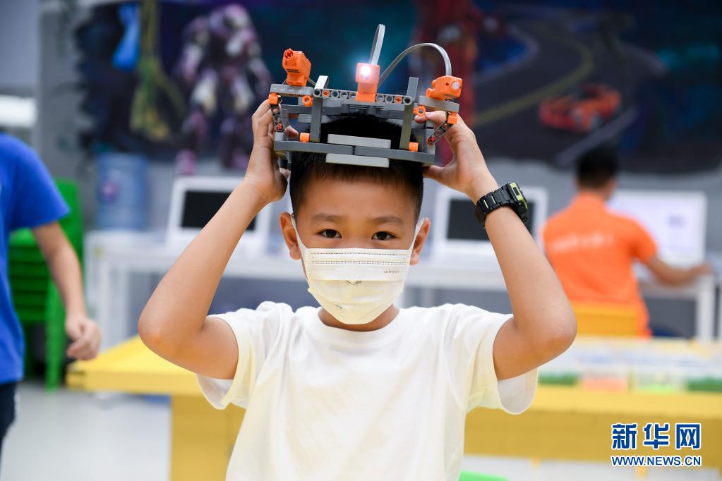 8月4日,在深圳市少年宫暑期科技班,11岁的许梓轩测试自己拼装的“头灯”。他的母亲屈春兰是宝安区永丰社区的一名义工。