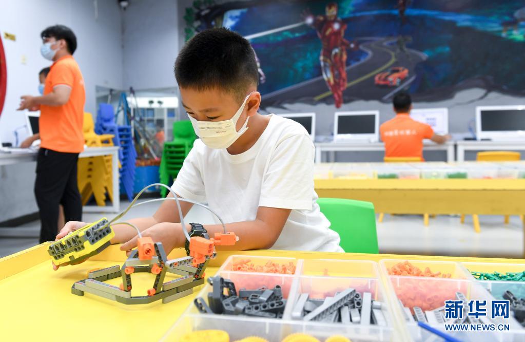 8月4日,在深圳市少年宫暑期科技班,11岁的许梓轩测试自己拼装的“头灯”。他的母亲屈春兰是宝安区永丰社区的一名义工。