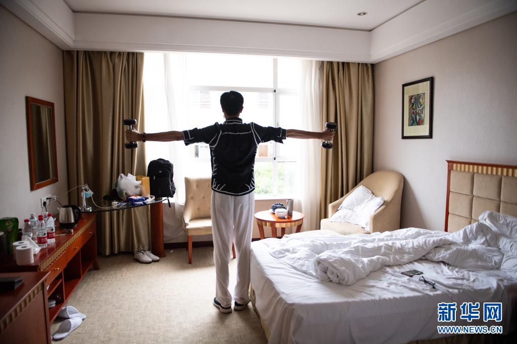 8月8日,在湖南省张家界武陵源区青和锦江国际酒店,上海游客张毛弟在房间内用哑铃健身。8月3日,湖南省张家界市宣布,在张家界境内的居民、游客等所有人员不得离开张家界,目前尚有1200余名游客滞留。