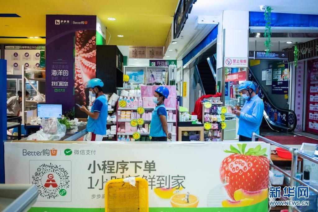 8月5日,在湖南省张家界市永定区步步高超市十字街店,外卖员排队提取市民订货。