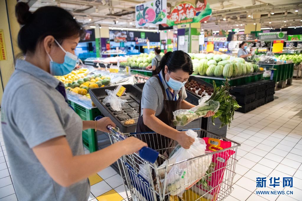 8月5日,在湖南省张家界市永定区步步高超市十字街店,工作人员为订货市民挑选蔬菜。