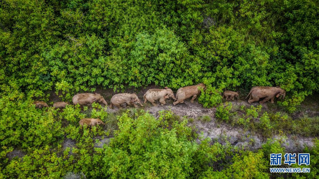 这是8月9日在云南省玉溪市元江县境内拍摄的象群(无人机照片)。新华社记者 胡超 摄