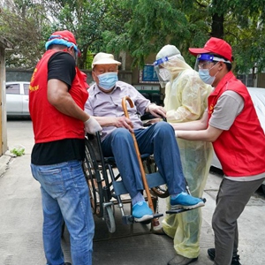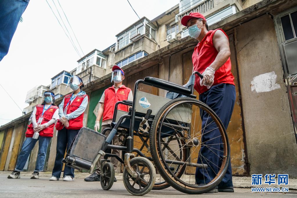 疫情防控期间,在扬州市广陵区汶河街道四望亭社区,活跃着一支助老轮椅小分队,他们上门接送出行不便的老人前往核酸检测点进行核酸检测取样。