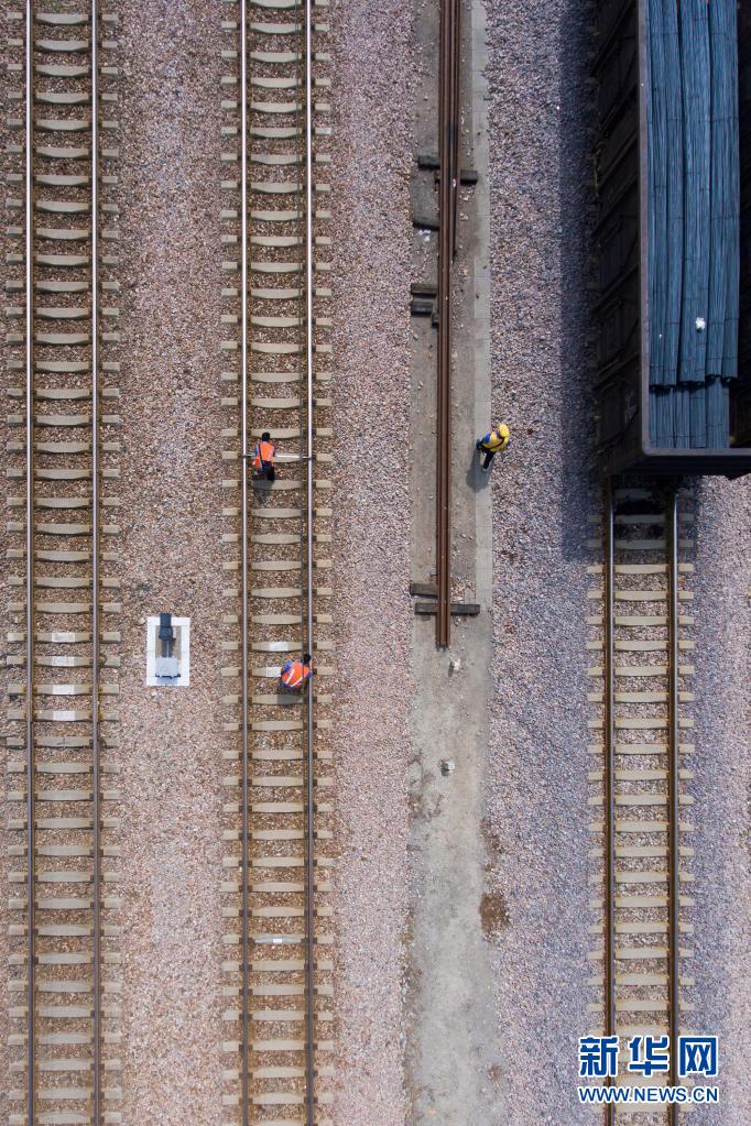8月11日,李宁(左上)和同事王大卫(下)在南同蒲线运城站对铁路线路进行巡视检查(无人机照片)。