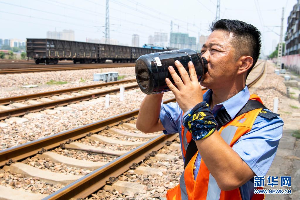 8月11日,在南同蒲线运城站,李宁在“巡热”过程中喝水。