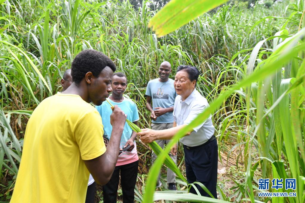 8月12日,福建农林大学国家菌草工程技术研究中心首席科学家林占熺(右一)让卢旺达留学生欧贝德·尼伊姆巴巴兹试尝幼嫩菌草的味道。