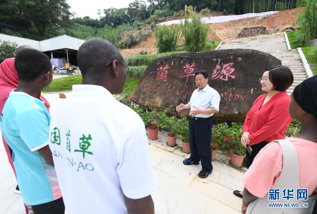 8月12日,福建农林大学国家菌草工程技术研究中心首席科学家林占熺(右三)为来自非洲的留学生讲授菌草生态治理技术。