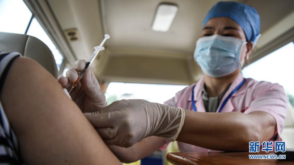 8月12日,在广西融安县融康社区,疫苗接种流动车上的医务人员在给群众接种疫苗。