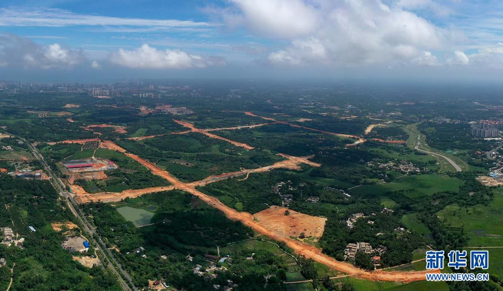 这是文昌国际航天城起步区“三横五纵”路网工程施工工地(8月14日摄,无人机照片)。