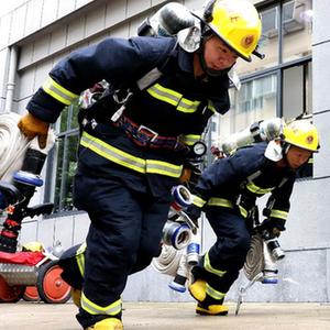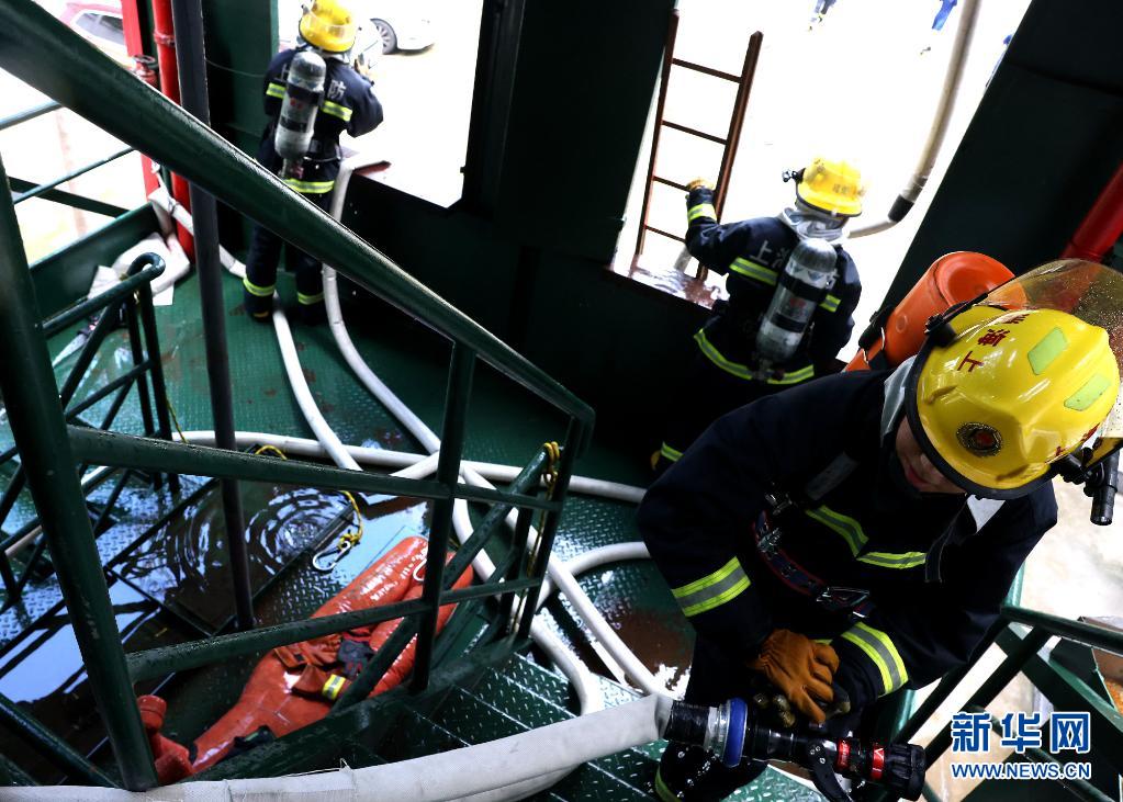 8月17日,消防员在冲锋塔内进行登楼内攻演练。