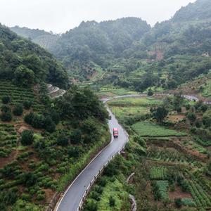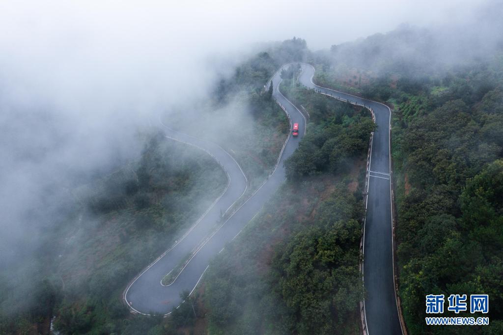 8月17日,公交车从海拔800米的诸暨市赵家镇桃岭村前往山下的镇区(无人机照片)。