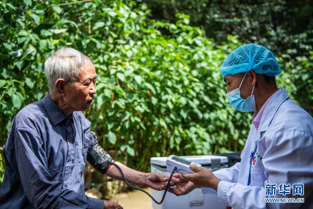 章忠武在给赵仕明老人测量血压(8月16日摄)。
