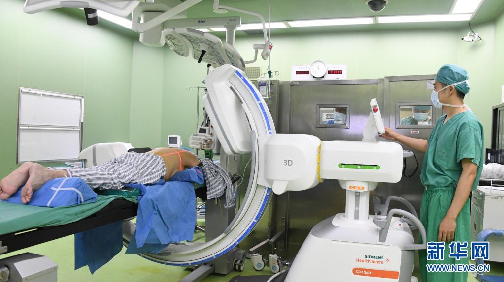在北京市海淀医院手术室,马元通过C型臂为患者进行骨骼三维扫描(8月3日摄)。新华社记者 任超 摄