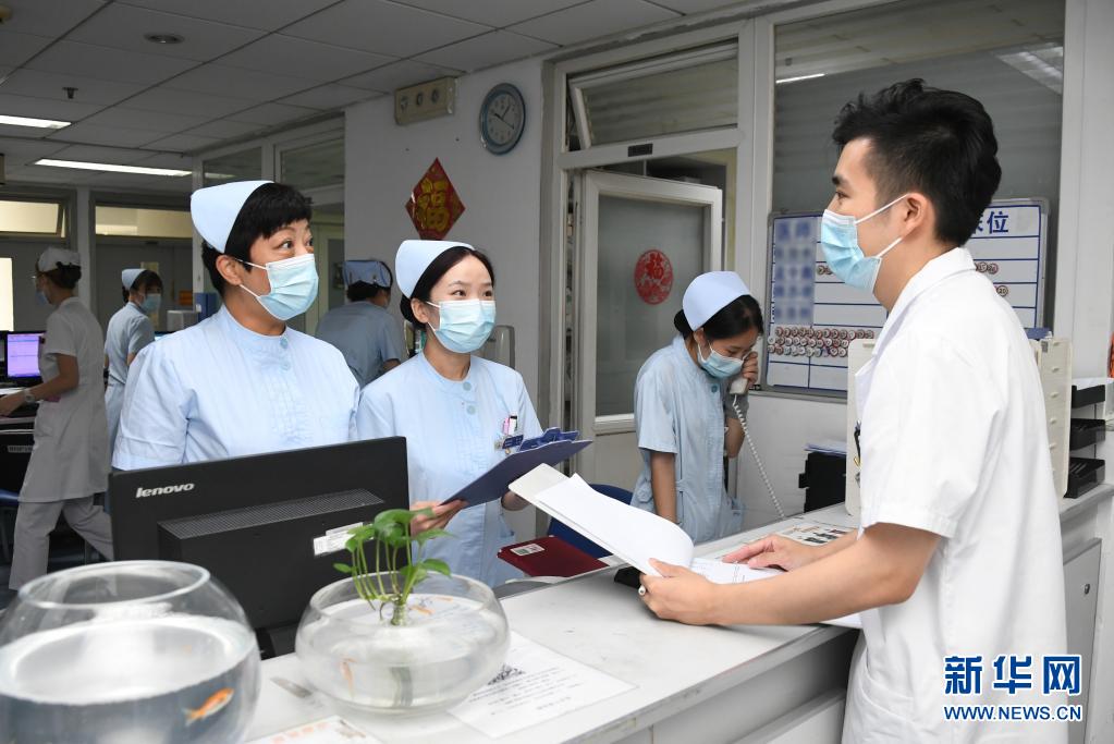在北京市海淀医院住院楼骨科病房护士站,马元(右一)向值班护士了解患者情况(8月12日摄)。新华社记者 任超 摄