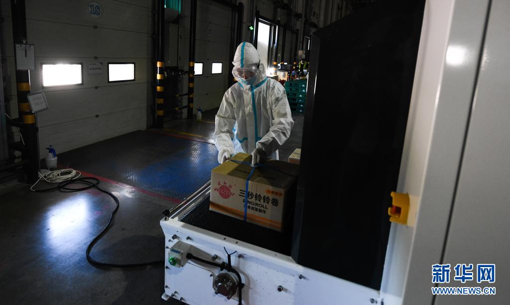 8月19日,在桂林洋经济开发区罗牛山冷链物流园内的收发货分拣区,工作人员为进口冷链食品消毒。