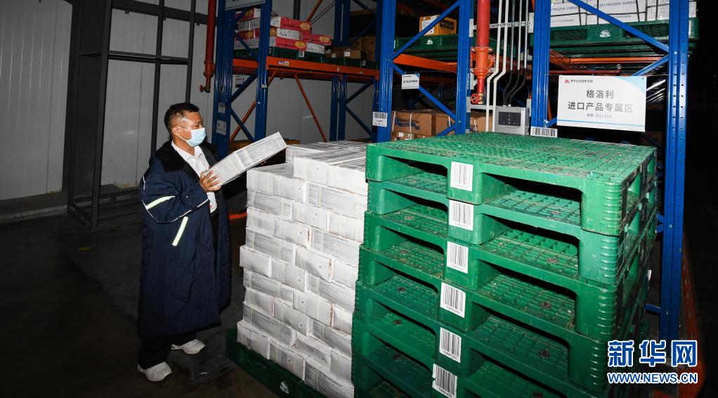 8月19日,海口市市场监督管理局桂林洋分局工作人员在桂林洋经济开发区罗牛山冷链物流园内的冷库中检查进口冷链食品的溯源码。