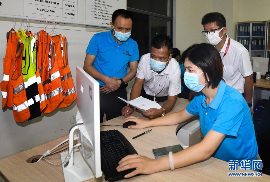 8月19日,海口市市场监督管理局桂林洋分局工作人员在桂林洋经济开发区罗牛山冷链物流园内的办公区查看仓运通系统操作步骤。
