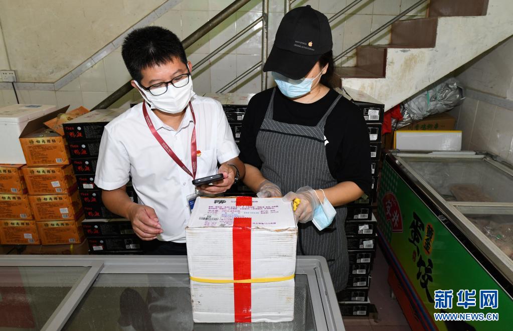 8月19日,在海口市美兰区国营桂林洋农贸市场,海口市市场监督管理局桂林洋分局工作人员在销售端检查进口冷链食品溯源码。