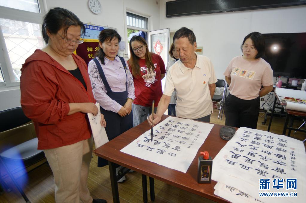 8月19日,85岁的退休老党员孙海水(右二)在社区文化服务站指导居民学习书法。