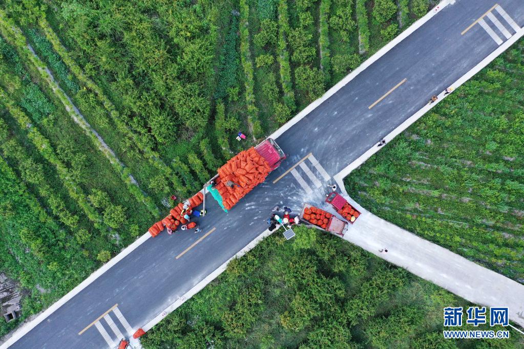 8月18日,在贵州省龙里县洗马镇台上村,加工企业将收购的刺梨鲜果装车(无人机照片)。