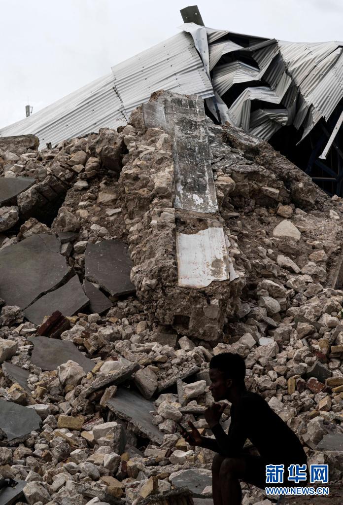 8月19日,海地南部省的一名男子在废墟旁看手机。