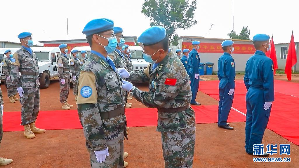 8月19日,中国首批赴阿卜耶伊维和直升机分队官兵出席授勋仪式。