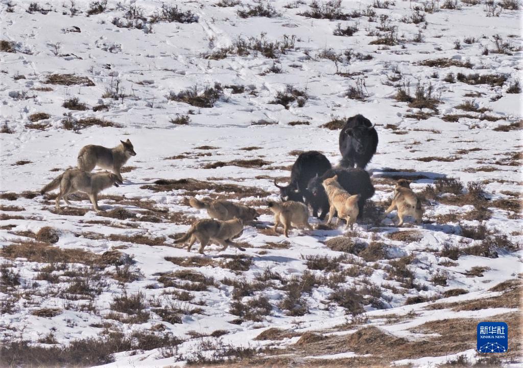 这是在四川省阿坝藏族羌族自治州若尔盖县境内拍摄的草原狼围攻牦牛(2019年12月18日摄)。
