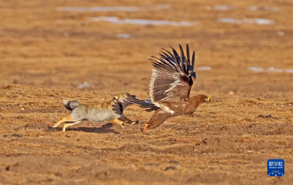 这是在四川省阿坝藏族羌族自治州若尔盖县境内拍摄的一只藏狐追击草原雕(2020年12月1日摄)。