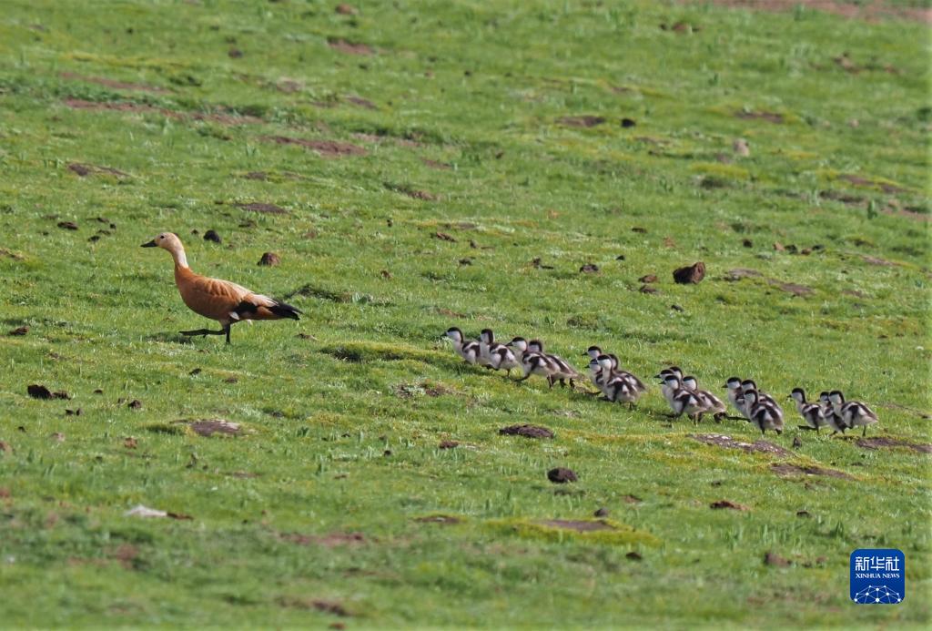 这是在四川省阿坝藏族羌族自治州若尔盖县境内拍摄的带着多只幼崽的赤麻鸭(2021年6月6日摄)。