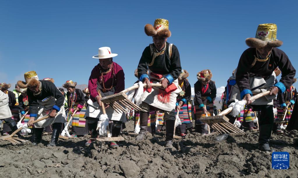 西藏山南市乃东区克松社区居民参加春耕仪式(3月16日摄)。
