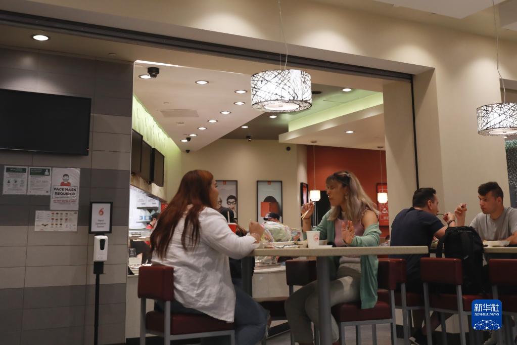 8月20日,人们在美国旧金山市一家餐厅就餐。餐厅墙上贴着印有“室内需戴口罩和接种疫苗”字样的告示。