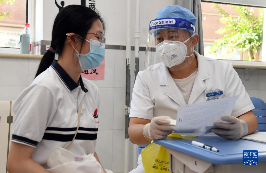8月21日,在北京市育英学校航天校区,医护人员在接种前询问学生身体状况。