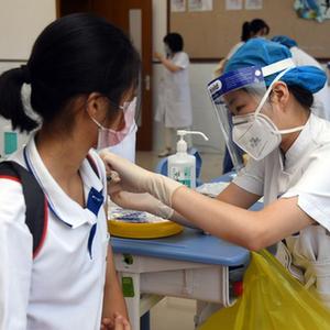 当日,航天中心医院的医护人员来到北京市育英学校航天校区,为初一至初三学生进行新冠疫苗接种。